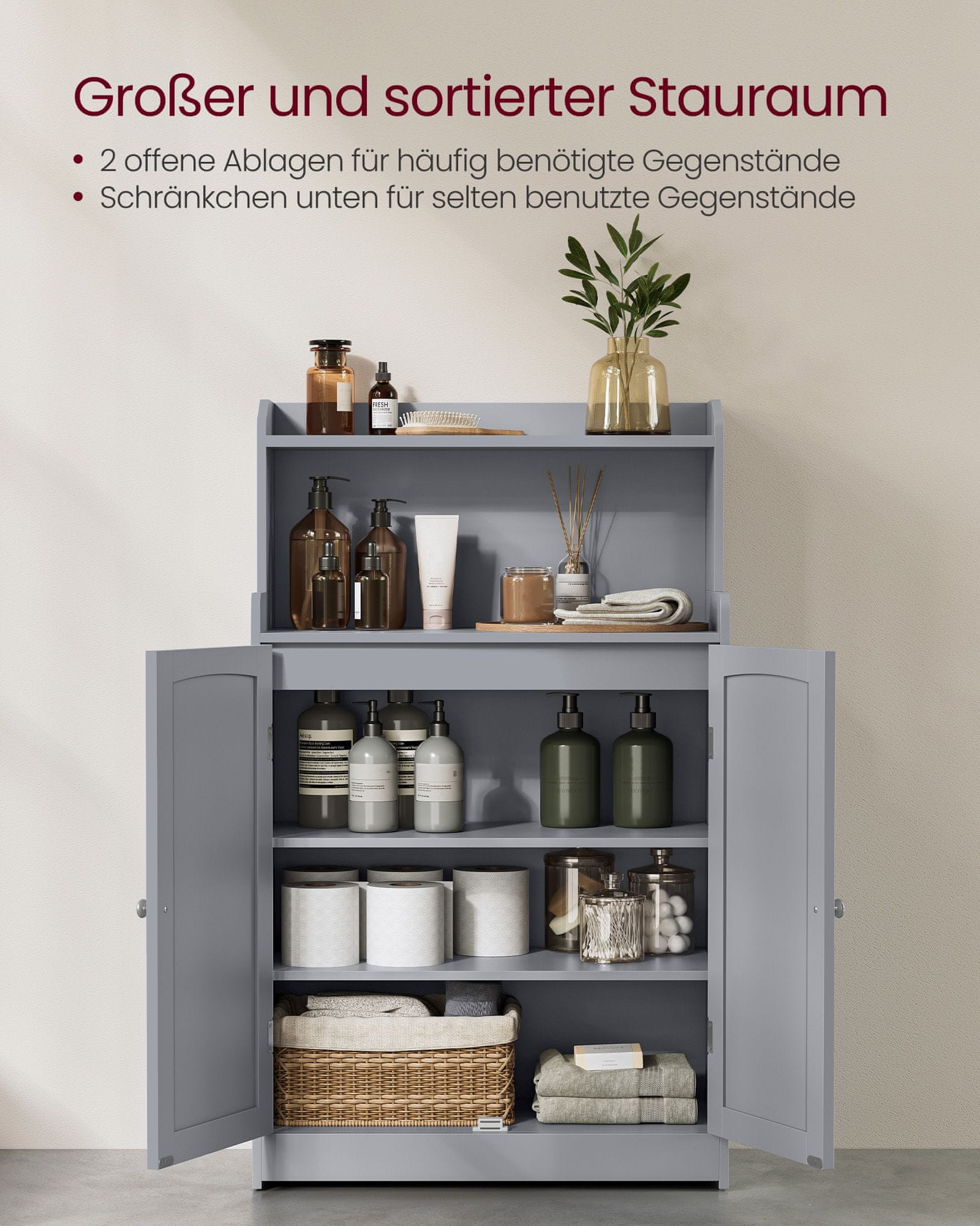 Ovaj svestrani ormar nudi obilje prostora za pohranu za vašu kupaonicu, kuhinju ili dnevni boravak. S podesivim policama iza dviju vrata pomaže održati vaš dom organiziranim i urednim. Njegov moderan dizajn savršeno se uklapa u različite interijere.