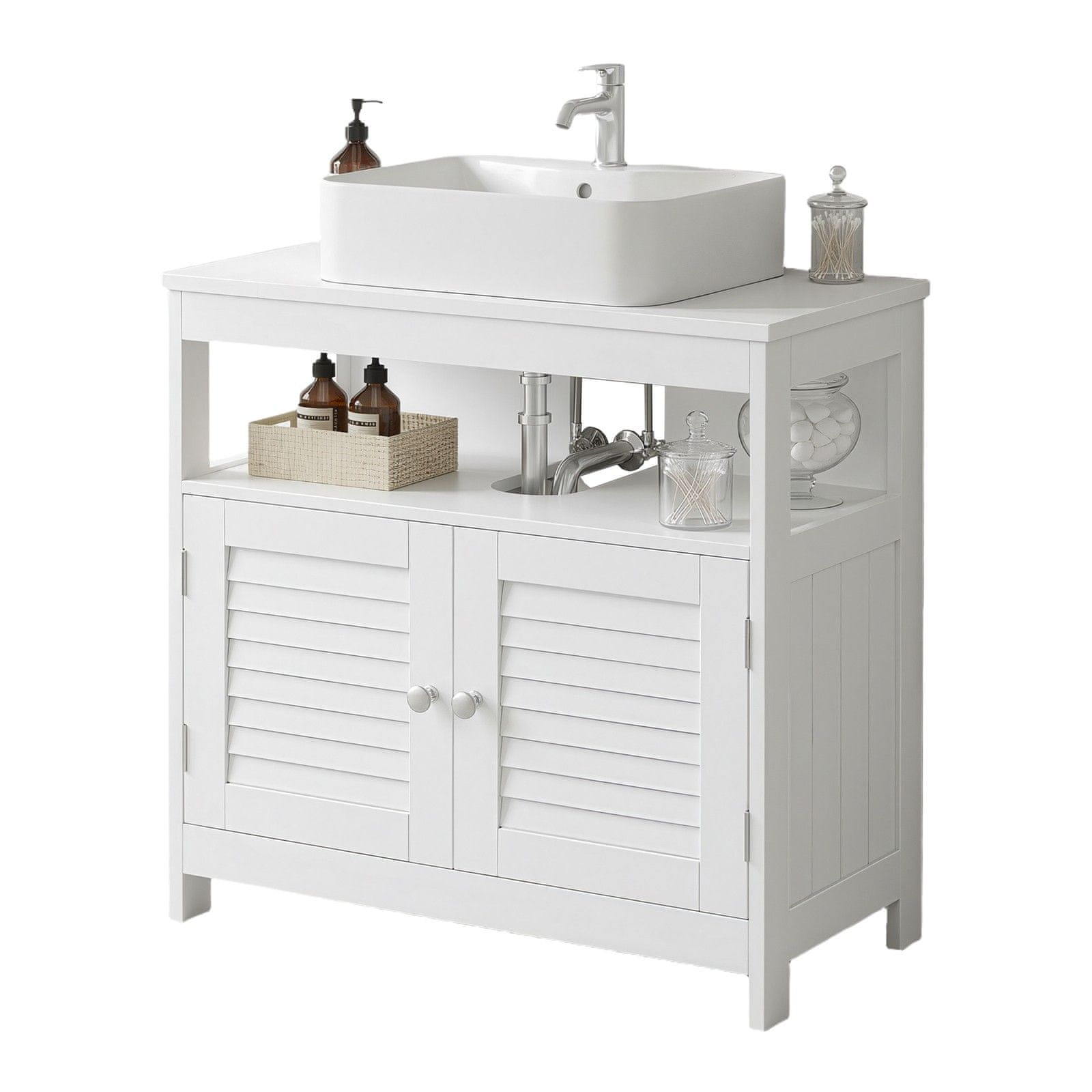 Ovaj ormarić ispod umivaonika nudi praktično rješenje za pohranu u vašoj kupaonici pomažući vam učinkovito organizirati toaletne potrepštine i sredstva za čišćenje. Dizajniran da stane ispod većine umivaonika ima žaluzinska vrata za moderan izgled i lak pristup sadržaju. Njegov kompaktni oblik čini ga idealnim za kupaonice s ograničenim prostorom.