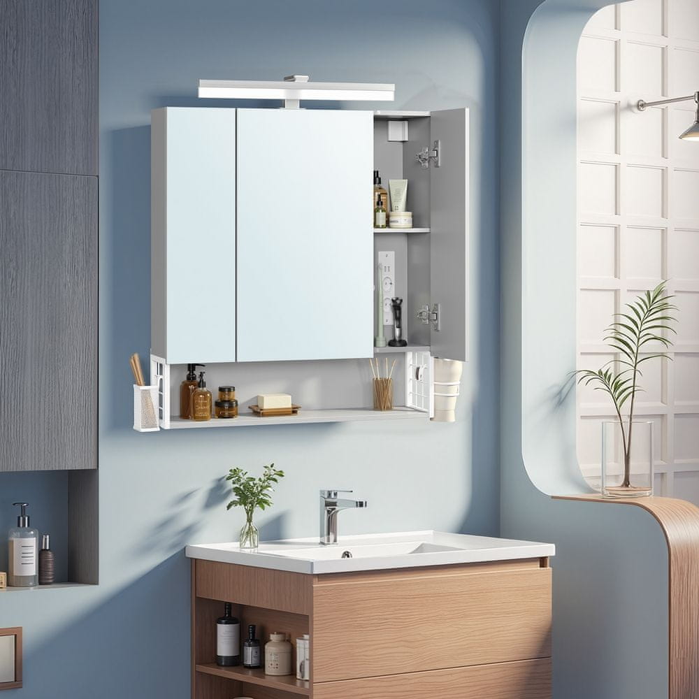 Ovaj kupaonski ormarić nudi praktično i moderno rješenje za pohranu u vašoj kupaonici. Dizajniran za montažu na zid ima ogledala na vratima i više pretinaca koji pomažu u organizaciji vaših toaletnih potrepština i dodataka. Njegov moderan izgled i funkcionalan dizajn čine ga prikladnim za različite stilove kupaonica.