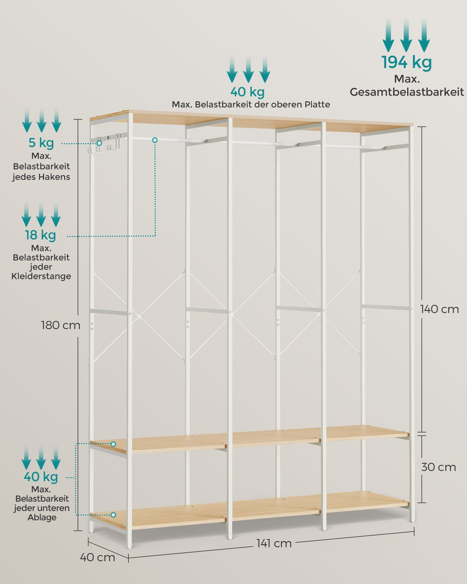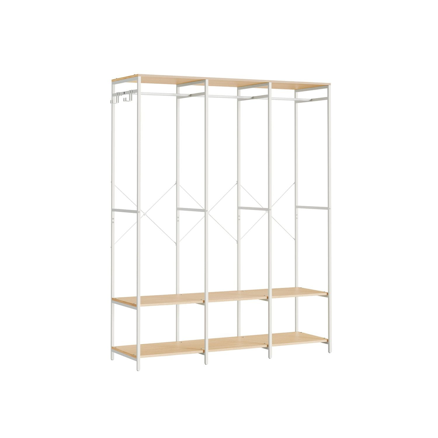 Ovaj otvoreni ormar nudi praktično rješenje za organizaciju odjeće i dodataka u spavaćim sobama garderobnim sobama ili hodnicima. Kombinacijom prostora za vješanje polica i uklonjivih kukica pruža svestrane opcije za pohranu odjevnih predmeta cipela i torbi. Njegov neutralni dizajn skladno se uklapa u različite stilove interijera.