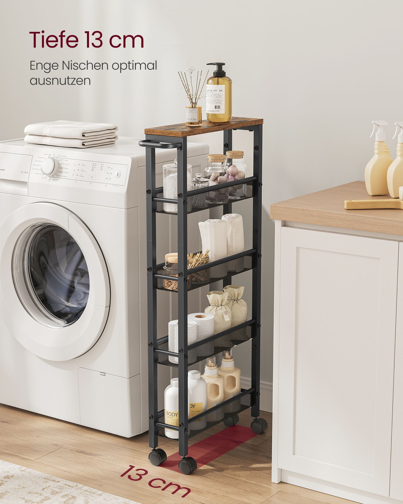 Ovaj tanak kolica na kotačiće dizajnirana su za maksimalno iskorištavanje prostora u malim prostorijama što ih čini idealnima za kuhinje kupaonice dnevne sobe ili kućne urede. Njihov višeslojni dizajn pruža dovoljno prostora za organizaciju raznih predmeta dok čvrsta konstrukcija osigurava pouzdanu upotrebu. Integrirana ručka i kotačići za glatko kotrljanje omogućuju jednostavnu mobilnost i fleksibilno postavljanje gdje god vam treba dodatni prostor za pohranu.
