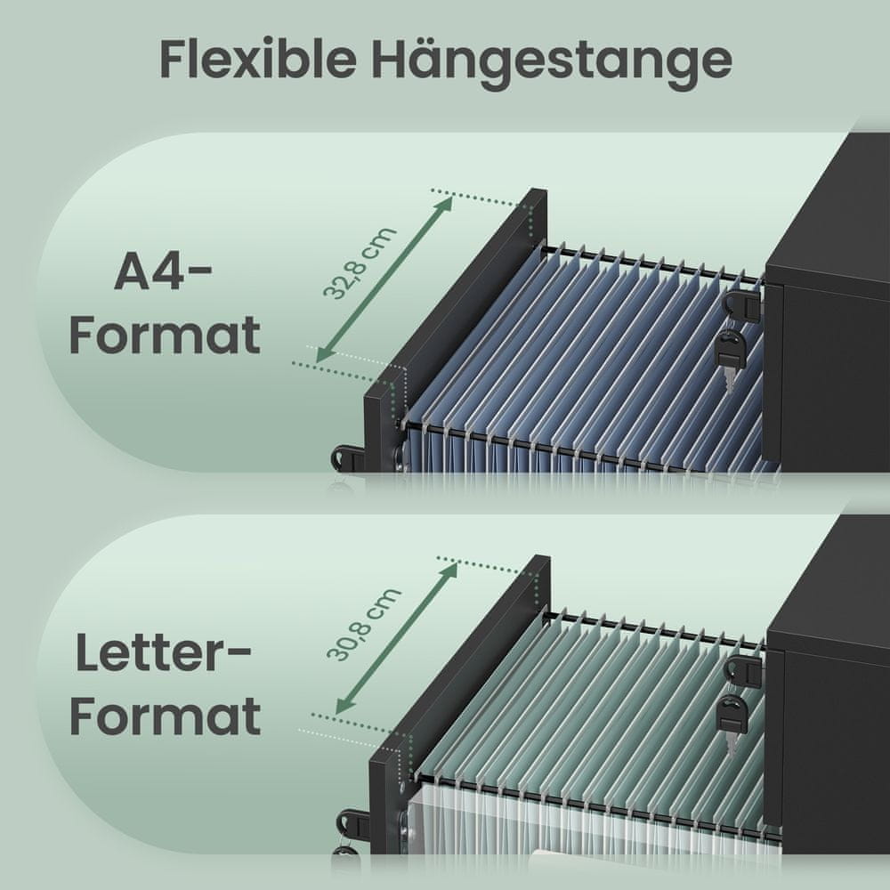 Ovaj svestrani pokretni ormarić za arhiviranje dizajniran je za praktično spremanje i organizaciju vašeg kućnog ureda ili radnog prostora. Sa svojim zaključavajućim ladicama i podesivim sustavom za viseće fascikle nudi sigurno i fleksibilno spremište za dokumente u A4 i letter formatu. Ormarić je jednostavan za pomicanje zahvaljujući pet kotačića što ga čini prikladnim za različite namjene uključujući i kao noćni ormarić ili pomoćni stol.