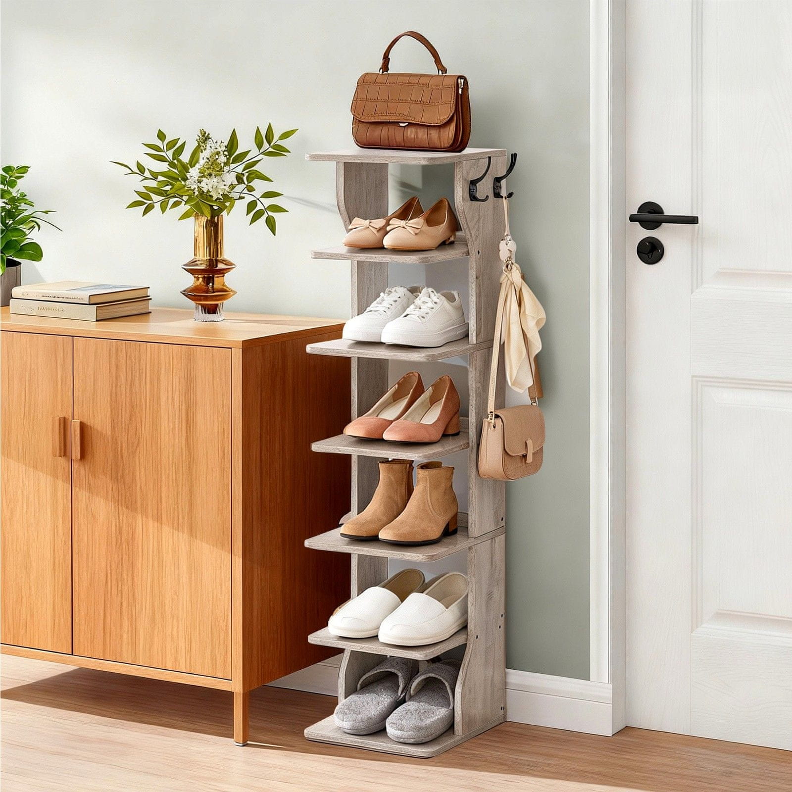 Ovaj tanak stalak za cipele dizajniran je kako bi pružio učinkovito rješenje za pohranu cipela u ulaznim prostorima kutovima ili drugim kompaktnim prostorima. Njegov vertikalni dizajn omogućuje uredno organiziranje više pari cipela uz uštedu dragocjenog prostora na podu. Stalak je prikladan za držanje vaše obuće lako dostupnom i urednom u vašem domu.