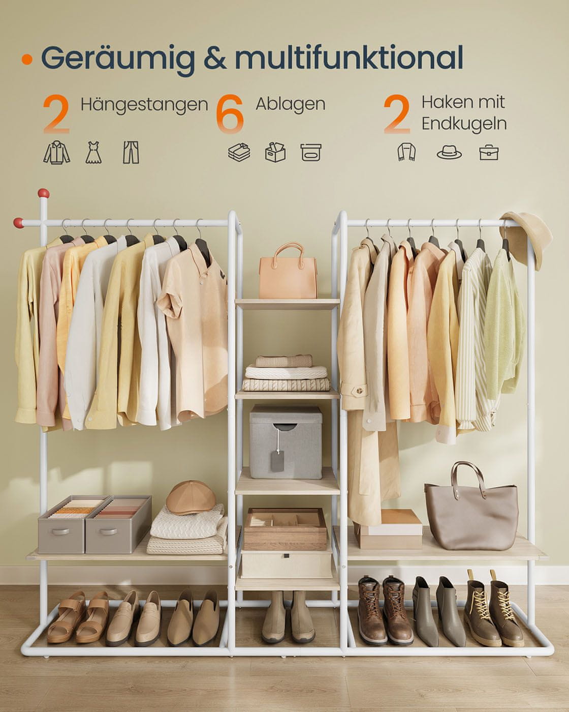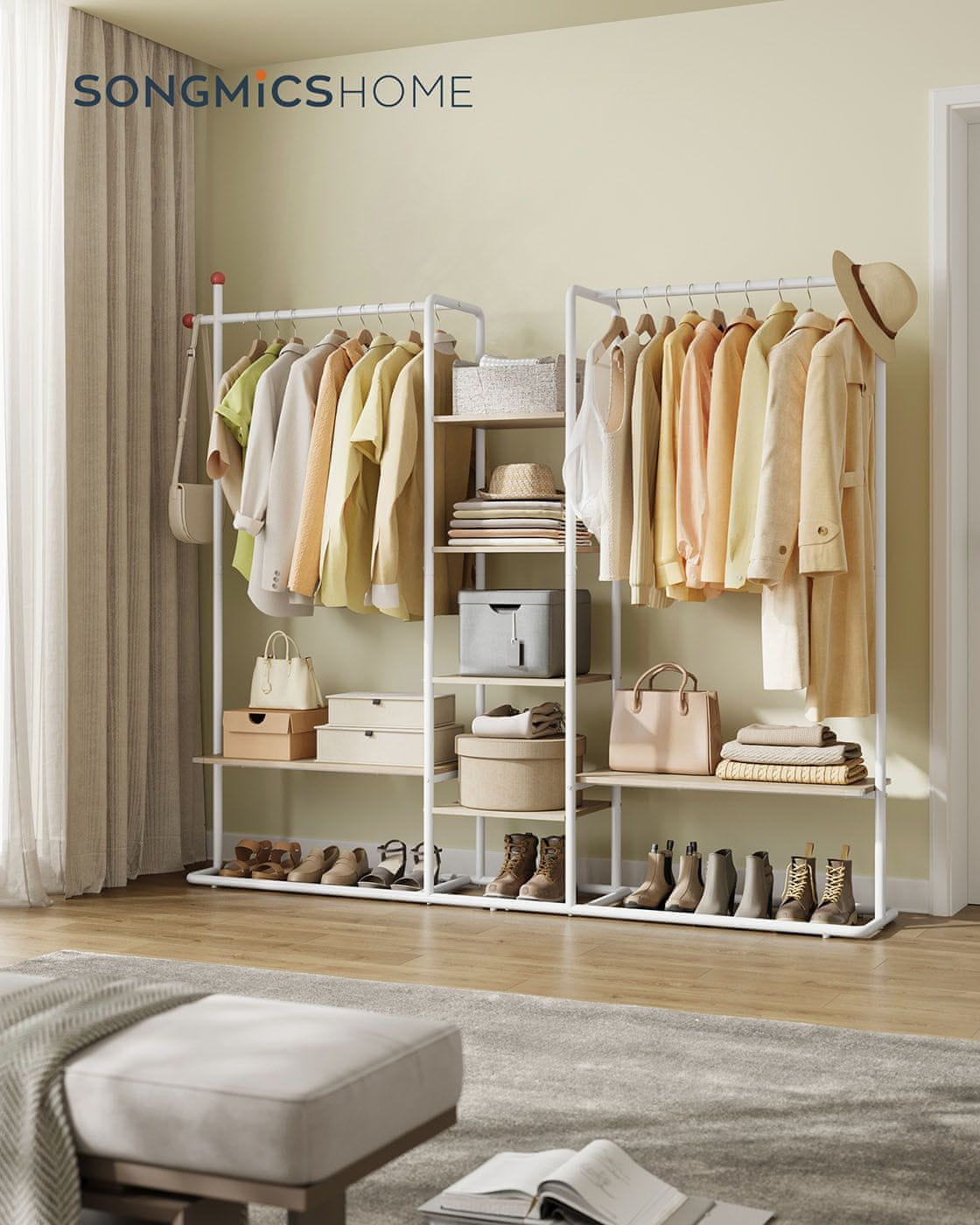 Songmics Stalak za odjeću 6 polica 2 šipke za vješanje 33.8x163.6x175.3 cm bež