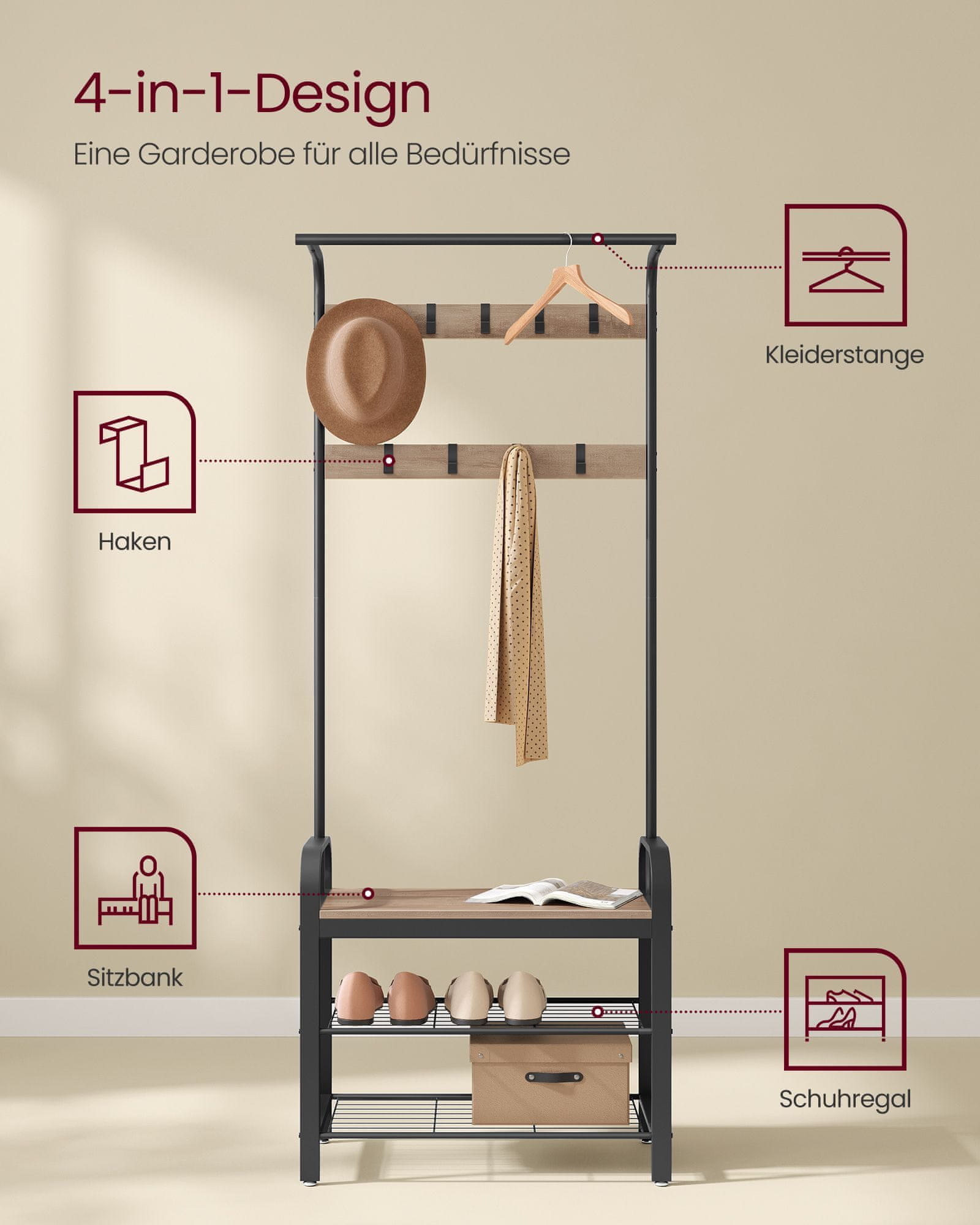 Stvorite dobrodošlicu u predsoblju s ovim vješalicom za kapute i klupom. Nudi praktičan prostor za pohranu jakni, torbi i cipela, dok pruža zgodno mjesto za sjedenje prilikom obuvanja ili svlačenja obuće. Idealno za održavanje vašeg hodnika urednim i privlačnim.