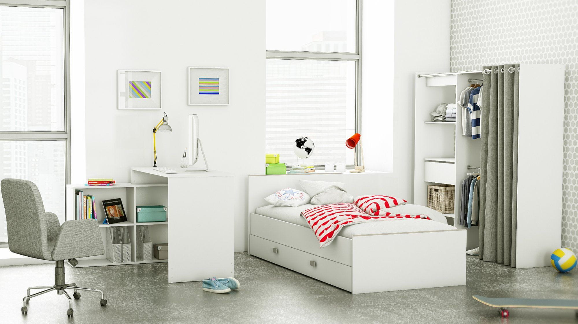 Garderobni ormar Čiko sastoji se od jedne cjeline s tri police i jednom ladicom, a s druge strane ormar ima jedinicu s dvije viseće šipke. Može se pohvaliti elegantnom zavjesom. Ormar je dostupan u bijeloj boji.
