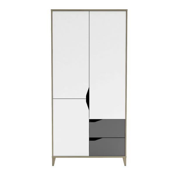 Dječja i omladinska garderoba izrađena je u skandinavskom stilu. Podignute stožaste noge i rubovi ormarića izrađeni su u drvetu. Ormarić je izrađen od ivičastih ploča ivica u prevladavajućoj bijeloj boji, nadopunjenoj tamno sivom bojom vrata ladica. Vrata imaju polukružne izreze na rubovima, koji zamjenjuju ručke, a ujedno predstavljaju prekrasan dodatak dizajnu.