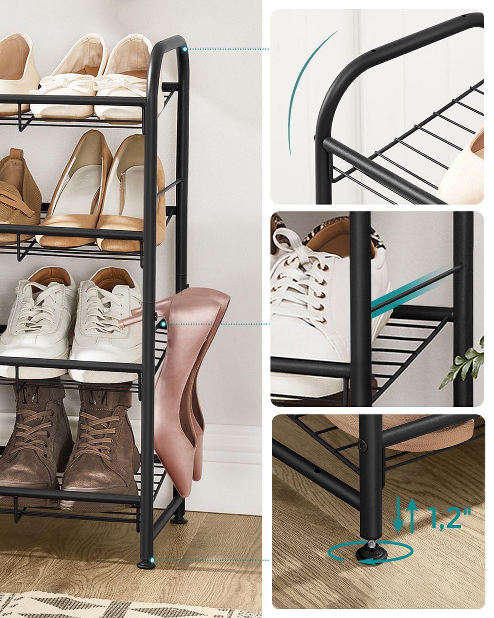 Ovaj svestrani stalak za cipele s 4 police dizajniran je kako bi vam pomogao učinkovito organizirati obuću u hodnicima spavaćim sobama ormarima ili garažama. Prikladan je za različite vrste obuće uključujući visoke pete tenisice papuče i kratke čizme držeći ih uredno složenima i lako dostupnima. Čvrsta čelična konstrukcija osigurava pouzdanu potporu i stabilnost dok se modularni i prilagodljivi dizajn omogućuje maksimalno iskorištavanje prostora za pohranu prema vašim potrebama.