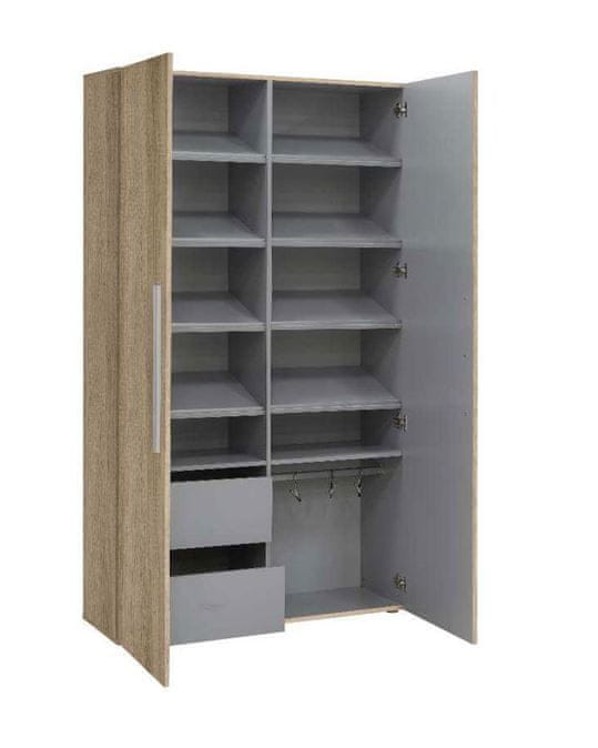 Veliki dvokrilni ormar za pohranu obuće je savršen komad namještaja za vaše predsoblje. Nudi veliki prostor u kojem će vaša obuća biti pregledna i u tren ćete naći baš one koje ste tražili. Također ima i dvije ladice u koje možete pospremiti papuče, kišobrane ili ostale male stvari.