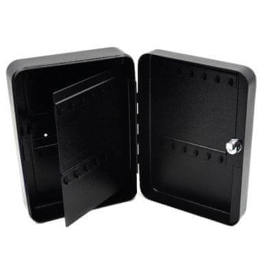 Metalna kutija za ključeve. Ima kukice za vješanje 48 ključeva (8 redova po 6 ključeva).Set sadrži: 2 igle i vijka za vješanje kutije, 2 ključa, samoljepljive naljepnice s brojevima od 1 do 48.Dimenzije kutije: 250 × 180 × 75 mm.