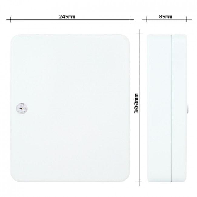 Ormarić za ključeve s cilindričnom ključanicom i dva ključa. Ormarić je izrađen od kvalitetnog metala, lakiran je i osigurava dugi vijek korištenja. Namijenjen je za ugradnju na zid, trake su fiksne i numerirane po redu. Ima 93 kukice.