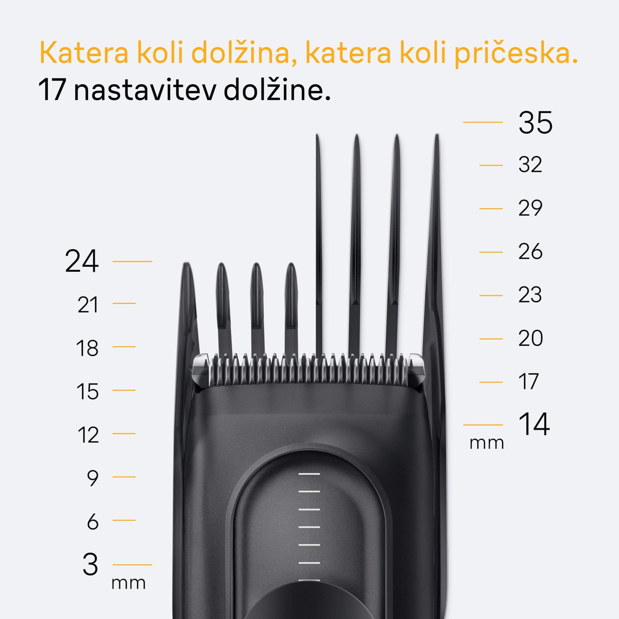 Ključne prednosti: – Jednostavno podrezivanje i oblikovanje kose kod kuće: oštrice koje ostaju oštre tijekom cijelog vijeka trajanja aparata omogućuju brzo i jednostavno podrezivanje kod kuće – bez obzira na duljinu ili debljinu kose – 17 duljina: odaberite između dva nastavka ili koristite aparat za šišanje bez nastavka. Memorijska blokada pamti i popravlja posljednju korištenu postavku, što podrezivanje kod kuće čini još lakšim – Jednostavno korištenje: ergonomska ručka aparata za šišanje s gumenim rukohvatom nudi udobnost, a aparat se lako čisti pod mlazom vode – Dodaci i pribor: ovaj muški aparat za šišanje uključuje postolje za punjenje i vrećicu s vezicom, što ga čini izvrsnim poklonom za muškarce – Napravljen za dugotrajnost: bežični aparat za šišanje opremljen je oštricama koje ostaju oštre tijekom cijelog vijeka trajanja aparata i snažnom Ni-MH baterijom koja omogućuje 50 minuta rada