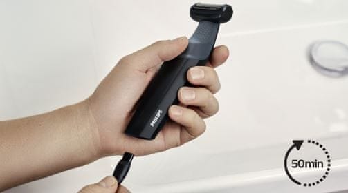 Vodootporni brijač za dlačice na tijelu, prikladan za suho i mokro brijanje. Brijač Philips BG3010/15 iz serije 3000 crne boje izdrži s jednim punjenjem do 50 minuta neometanog rada. Među dodatcima je dvosmjerni nastavak za brijanje 3 mm dugih dlačica.