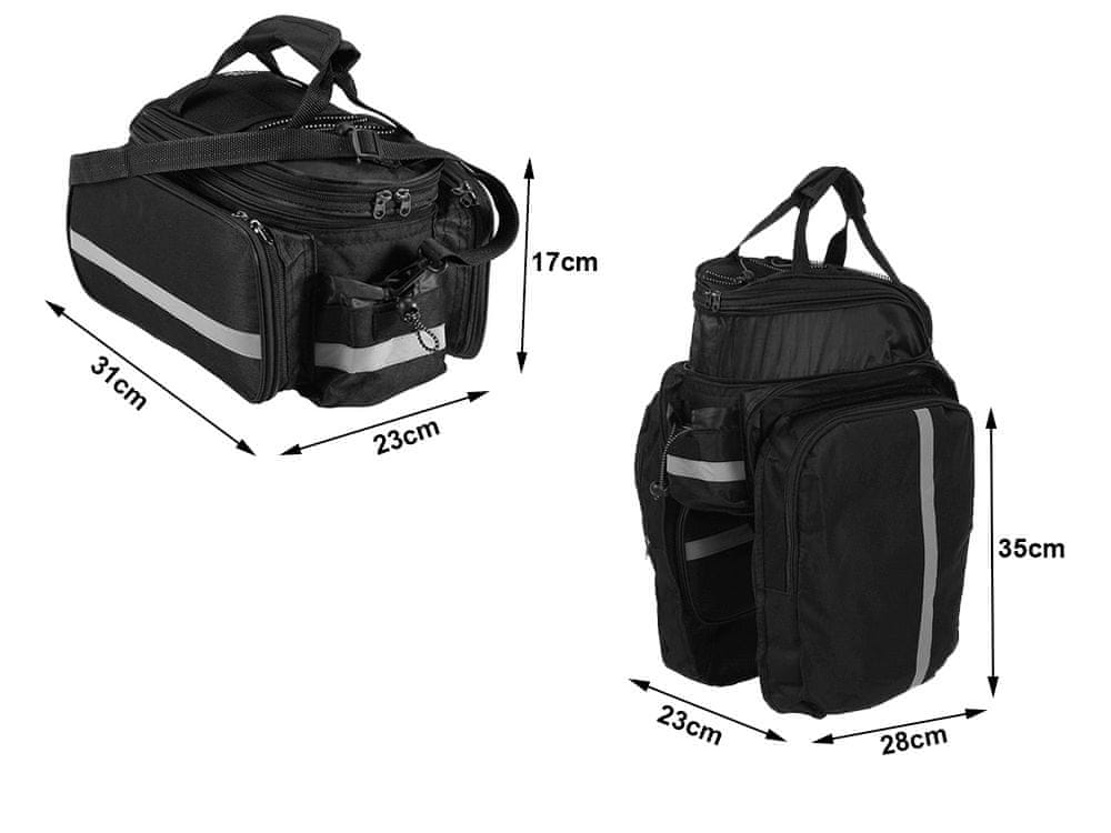 Višenamjenska velika biciklistička torba montirana na prtljažnik. Izuzetno korisna tijekom dugih biciklističkih putovanja, u nju možete spakirati odjeću, sitnice, hranu. Vrlo prostran, dodatno ima kišnu navlaku.