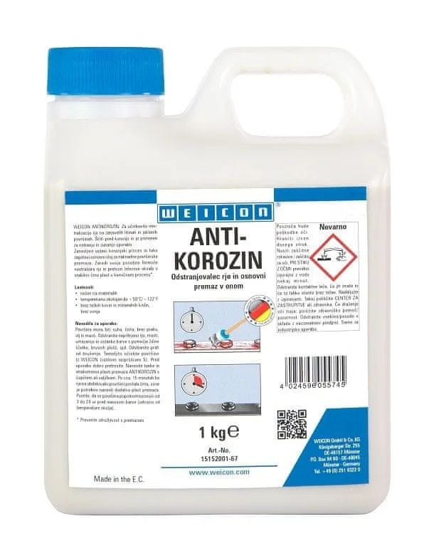 Weicon Antikorozin je nježan prema materijalima, temperaturno otporan do +50 °C, bez teških metala i mineralnih kiselina, bez mirisa. Nanosi se u tankim i ravnomjernim slojevima kistom ili valjkom. Nakon otprilike 15 minuta rđa na obrađenoj površini postaje crna. Prije nanošenja boje potrebno je pričekati da se površina potpuno osuši.