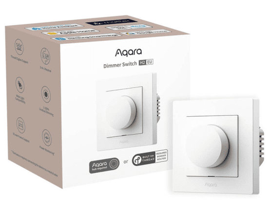 Aqara H2 prekidač za prigušivanje. Pritisnite za uključivanje ili isključivanje svjetla, a okrenite za glatko podešavanje svjetline od 1% do 100%. Kompatibilan je sa žaruljama sa žarnom niti, halogenim žaruljama i prigušivim CFL/LED svjetlima. Prekidač odgovara standardnim sustavima 55 × 55 mm i kompatibilan je s popularnim okvirima trećih strana kao što su Gira System 55 i Merten M. Cijeli opis