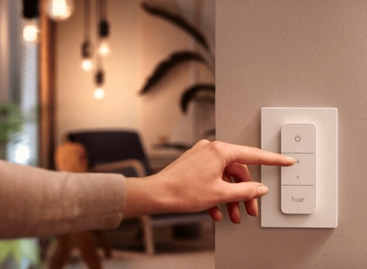 Daljinski upravljač sa prigušivačem Philips Hue Dimmer Switch omogućuje jednostavno bežično uključivanje/isključivanje ili glatku promjenu intenziteta svjetla do 10 Hue LED svjetiljki ili Hue LED žarulja bez potrebe za povezivanjem s Hue Bridge mostom, uz doseg do 12 m u interijeru koristeći ZigBee protokol (IEEE 802.15.4). Dolazi s zidnim držačem i uključenom knofličnom baterijom CR2032 s minimalnim trajanjem od 2 godine.