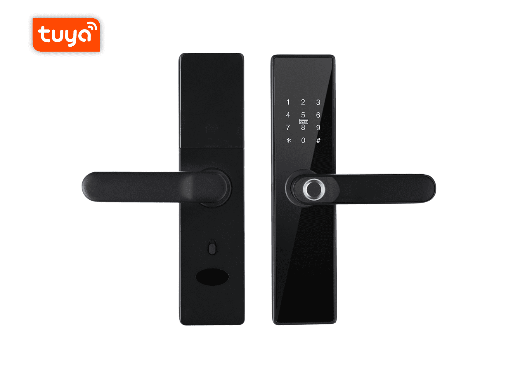 Pametna kvaka za vrata, Matter, WiFi, upravljanje putem mobilne aplikacije Tuya Smart/Smart Life, 5 opcija otključavanja (ključ, otisak prsta, numerički kod, čip kartica, mobitel), funkcija automatskog zaključavanja, moguća desna i lijeva orijentacija, napajanje s 4 AA baterije, crna.