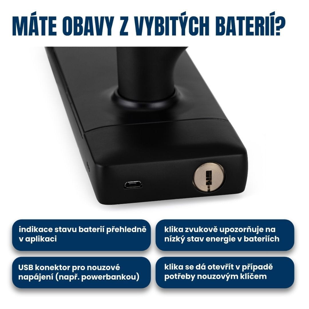 Pametna kvaka za vrata s Bluetooth / WiFi-jem, prikladna za unutarnja vrata i idealna za hotele, pansione i drugu komercijalnu upotrebu. Ne može se kombinirati s cilindričnim uložkom, kontrolira se putem TTlock aplikacije, 5 opcija otključavanja (ključ, otisak prsta, numerički kod, pametna kartica,