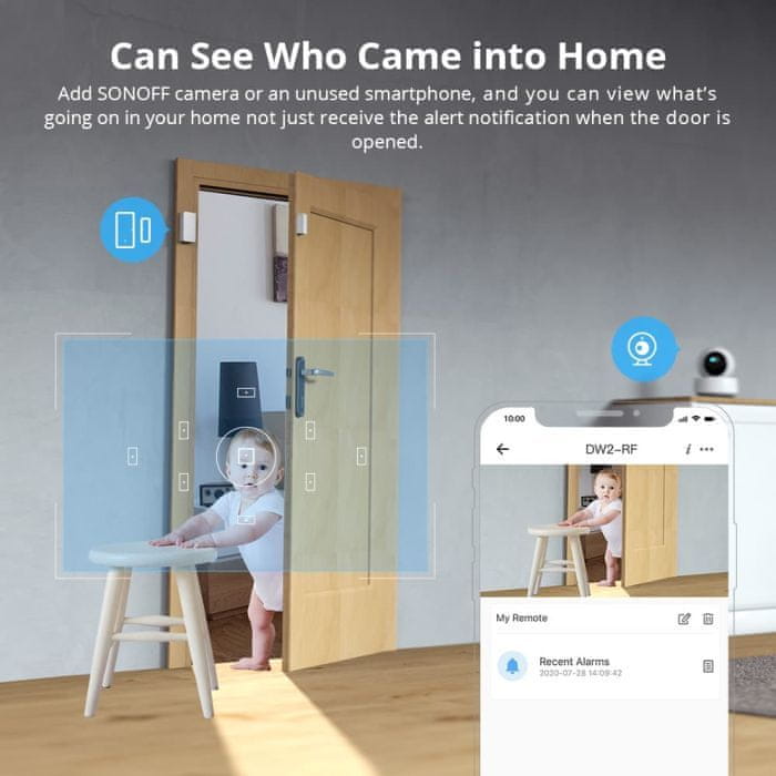 Pametni RF senzor za vrata i prozore s eWeLink aplikacijom. Dijelite kontrolu, sinkronizirajte uređaje i kreirajte pametne scene.