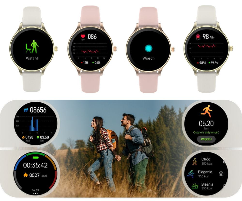 Mjerenje svih aktivnosti, analiza sna, menstrualni kalendar,… Veliki i svijetli 1,19" (3,02 cm) AMOLED zaslon u boji osjetljiv na dodir. SLOVENSKI I HRVATSKI JEZIK operativni sustav i izbornik za gledanje. Baterija sata traje nekoliko dana s jednim punjenjem. Besplatna aplikacija za Android i iOS uređaje. Širok raspon različitih brojčanika, sportskih načina rada i aplikacija. Bluetooth 5.2 povezivanje s pametnim uređajima. Standard vodootpornosti IP68. 2 verzije u boji – ružičasto zlato i luksuzno zlato. 2 remena uključena – silikonski i metalni.
