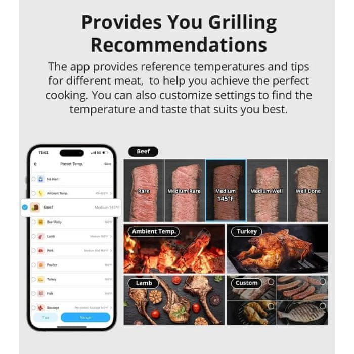 Aplikacija nudi referentne temperature i savjete za različite vrste mesa (govedina, janjetina, perad, riba, kobasice …). Postavke možete i prilagoditi prema vlastitim željama za savršeni okus.