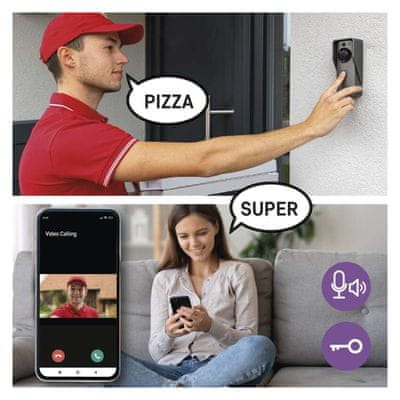 Uspostavite dvosmjernu govornu komunikaciju s posjetiteljem pomoću ugrađenog mikrofona, zvučnika i kamere. Možete komunicirati preko aplikacije na svom mobilnom telefonu. Ova značajka je odlična kada vas tijekom vaše odsutnosti posjeti vozač dostavljača – tako da ga možete uputiti susjedu koji će preuzeti paket umjesto vas ili ga zamoliti da pričeka.