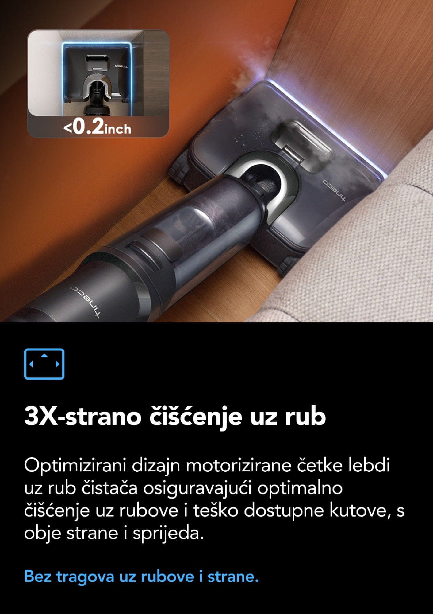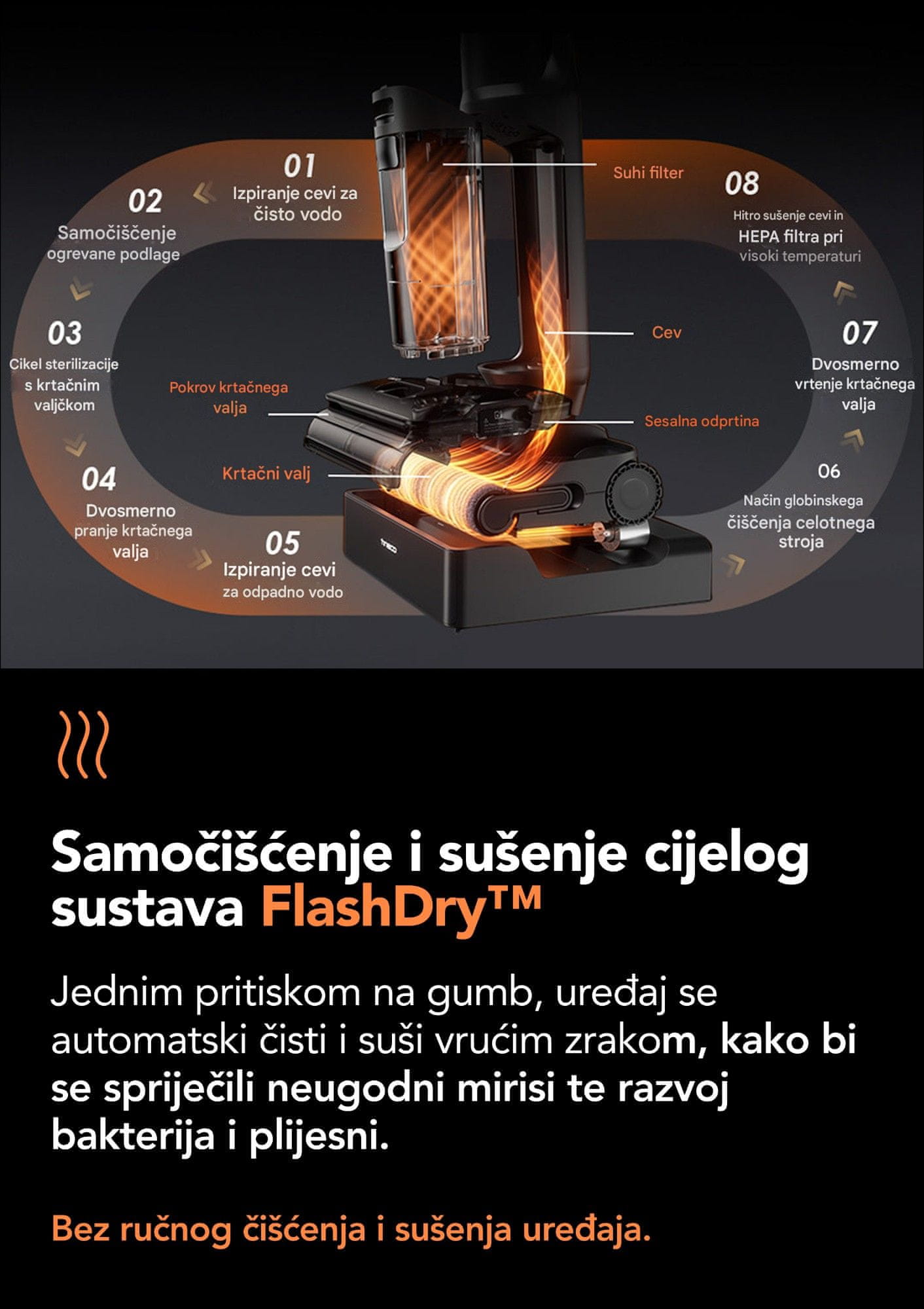 Sve-u-jedan usisava i pere s HyperSteam parom 160°C za tvrdokorne mrlje i higijenu bez kemikalija. 180° lay-flat ide ispod namještaja, DualBlock sprječava zapetljavanje dlaka, FlashDry ispire i suši četku, do 80 min rada, iLoop™ senzor prljavštine. Cijeli opis
