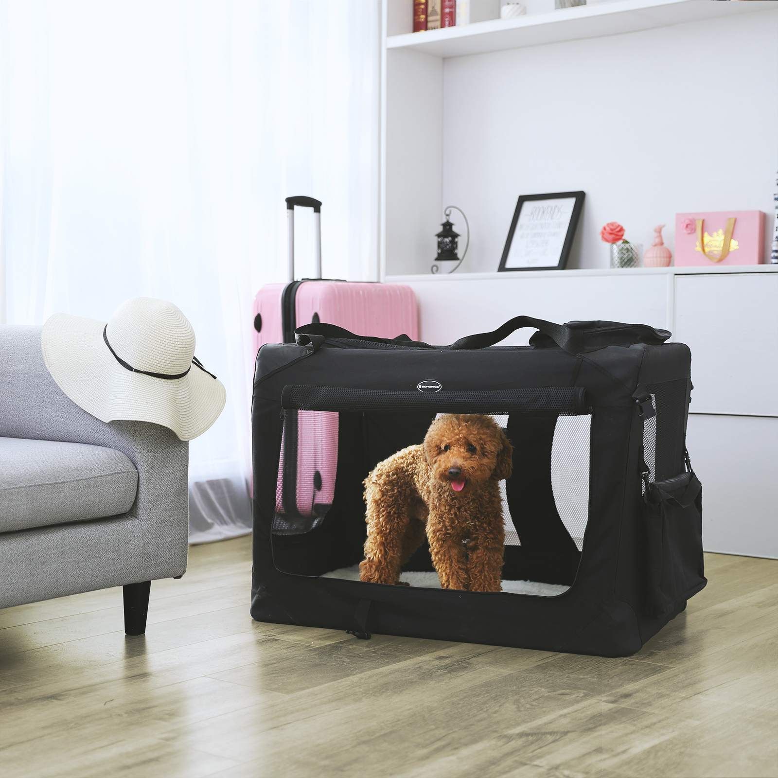Ova sklopiva transportna kutija za kućne ljubimce idealna je za siguran prijevoz pasa ili mačaka u vašem automobilu. Izrađena od izdržljive tkanine, pruža udobnost i sigurnost vašem ljubimcu tijekom putovanja ili kod kuće. Jednostavna za postavljanje i skladištenje kada se ne koristi.