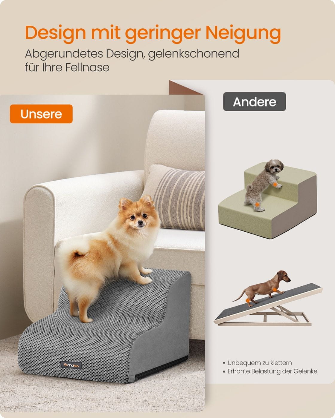 Ove stepenice za kućne ljubimce pomažu vašem psu ili mački da lako dosegnu krevete ili sofe, podržavajući nježno penjanje zahvaljujući stabilnom dizajnu protiv klizanja. Uklonjiva periva navlaka osigurava jednostavno čišćenje, što ih čini idealnim za svakodnevnu upotrebu u svakom domu.