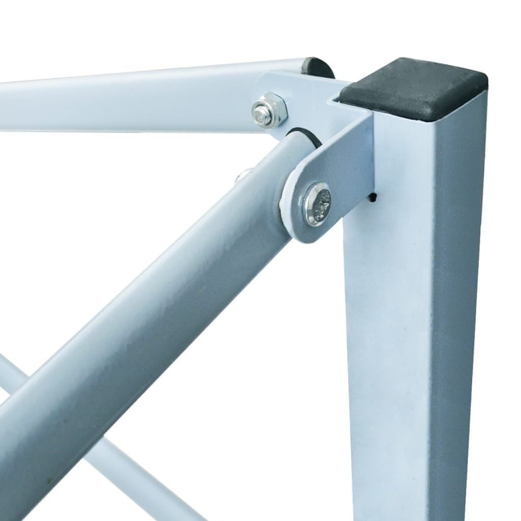 Izrađen od izdržljivog čelika s praškastim premazom, ovaj sklopivi šator za zabave izuzetno je izdržljiv. Krovni pokrov izrađen je od oksfordske tkanine s PVC premazom, što ga čini otpornim na vodu i UV zračenje. Šator ima četiri bočne stijenke, od kojih jedna ima patentni zatvarač za jednostavan pristup. Šator je sklopiv radi lakšeg skladištenja i transporta.
