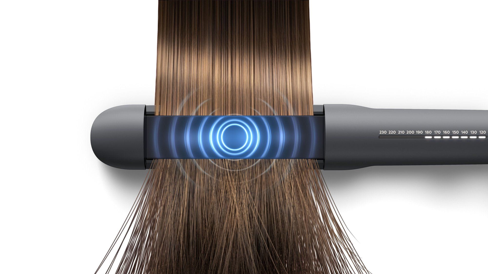 Napredne plutajuće keramičke ploče pomiču i podešavaju pritisak na kosu. To osigurava ravnomjernu toplinu i tlak potrebne za dobar rezultat dizajna. Raspon temperature od 120 °C do 230 °C osigurava dugotrajne rezultate uz smanjenje rizika od oštećenja kose.