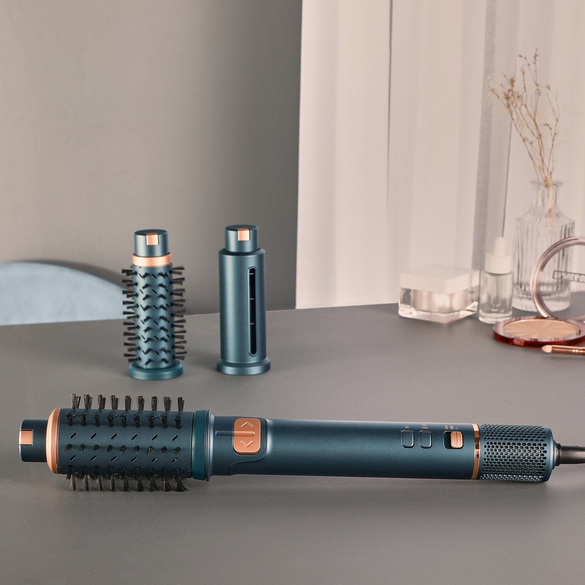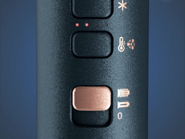 - Svestrani pribor: uključuje četku od 38 mm za čvršću frizuru, četku od 50 mm za glatki izgled s volumenom i valjak za dugotrajno oblikovanje.