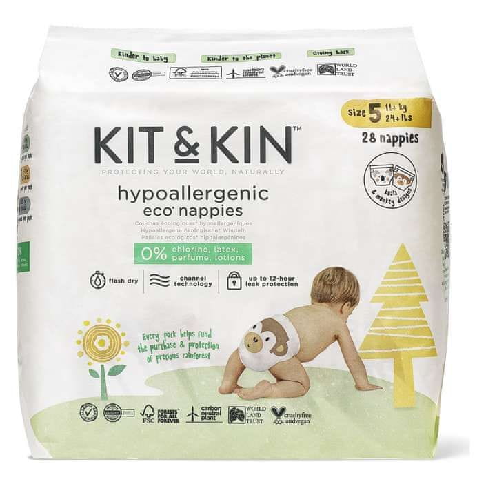 Pelene Kit&Kin prikladne su za malu djecu u 5. skupini. Pelene su hipoalergene, dermatološki testirane i izrađene od biljnih materijala. FlashDry tehnologija trenutno upija vlagu i održava kožu suhom. U pakiranju se nalazi 112 pelena.