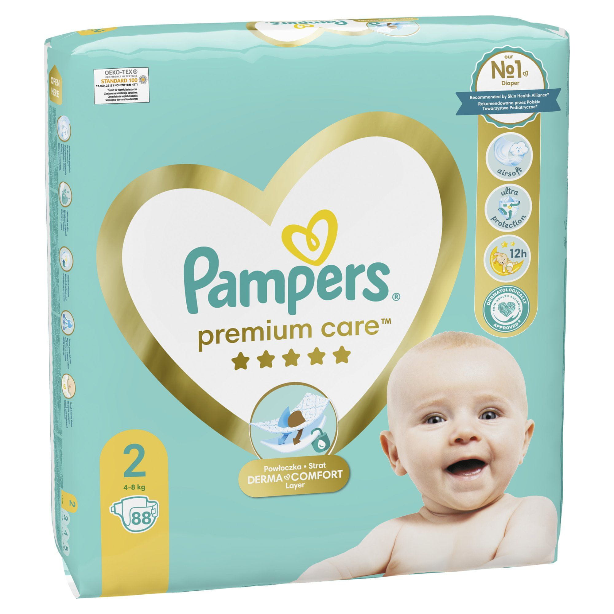 Premium Care pelene sprječavaju dugotrajni kontakt kože s urinom i tekućim izmetom, što kod djeteta izaziva nemir i uzbuđenje. Imaju poseban sloj Derma Comfort, koji s upijajućim porama odmah uklanja vlagu i tekućinu s kože. Osim toga, mikropore u pelenama omogućuju kontinuirano strujanje zraka u peleni. To održava bebinu kožu suhom i zaštićenom. Jedinstveni trostruki sustav zaštite brzo upija tekućinu i sprječava curenje oko struka i nogu, za do 12 sati zaštite. Meki materijali nude nježan kontakt s kožom.