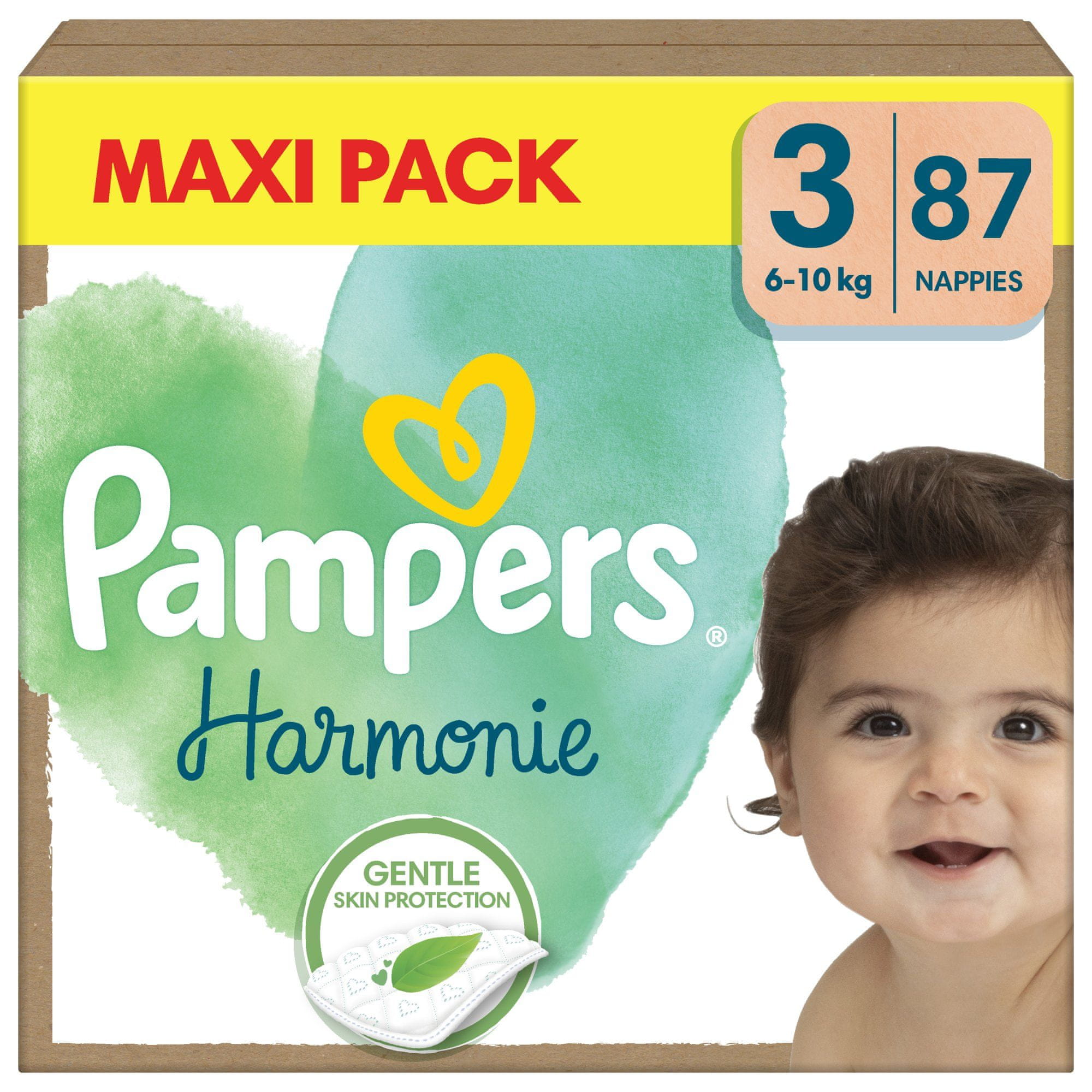 Pampers Harmonie pelene prikladne su za bebe težine od 6 do 10 kg. U Maxi pakiranju je 87 pelena. U papirnoj ambalaži koja se može reciklirati. Sadrži 5% plastične prevlake za očuvanje proizvoda.