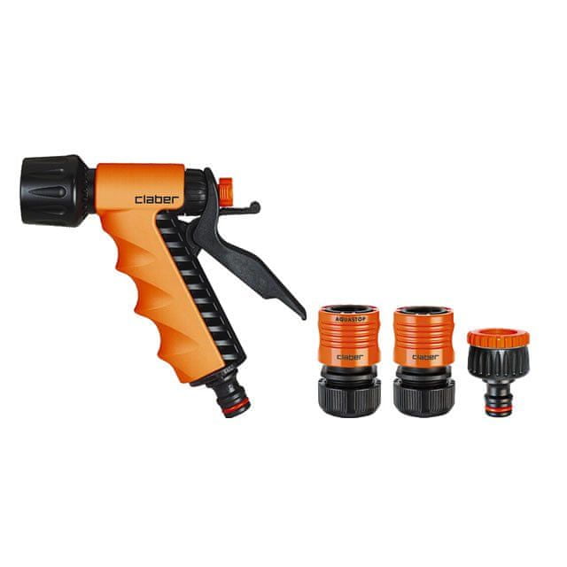 Komplet za početnike uključuje pištolj za prskanje Claber Ergo, 3/4" navojni priključak za slavinu (3/4" do 1/2") i dvije brze spojke za vrtne cijevi s navojem 1/2" (sa i bez ventila Aquastop).