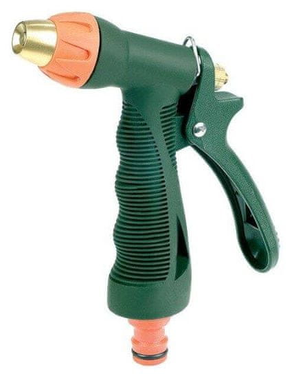 Vrhunski pištolj za prskanje s mesinganom glavom koja omogućuje podešavanje vodenog mlaza i AQUA STOP funkcijom, obogaćen ergonomski oblikovanom mekanom ručkom za maksimalnu udobnost i sigurnost pri korištenju.