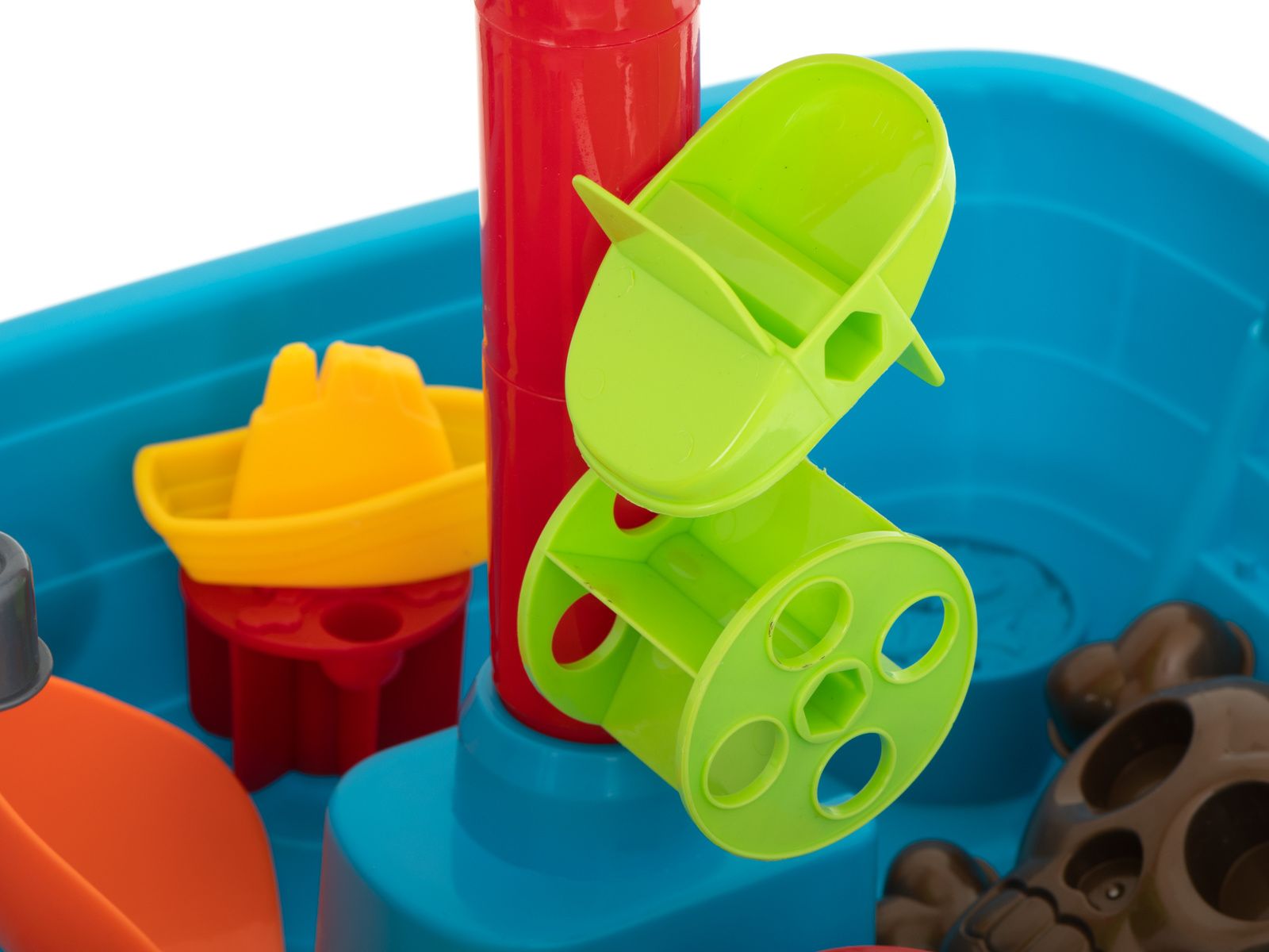 Edukativni stol za pijesak s pijeskom i priborom. Stol koji imitira gusarski brod odlična je ideja za vanjsku igru. Sadrži: pješčanik, lopaticu, grabljice, sito, 2 kalupa, pirata. Materijal: plastika.