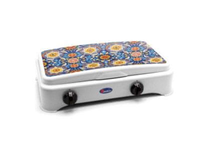 Dvostruki plinski kuhalnik CF Parker s poklopcem, namijenjen vanjskoj upotrebi s dvostrukim plamenicima, izrađen je od legure Pyral N2, s emajliranim poklopcem i emajliranom rešetkom.