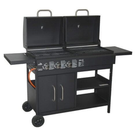 Roštilj se može pohvaliti ormarićem koji se nalazi ispod plinskog dijela roštilja i ima dvokrilna vrata s ručkama. Ispod roštilja na drveni ugljen nalaze se dvije police. Roštilj tako pruža više nego dovoljno prostora za pohranu. Preklopne bočne police također pružaju dodatni prostor za pohranu. Plinski roštilj je opremljen piezo paljenjem. Svaki od tri plamenika je podesiv pomoću okretnog gumba na prednjoj strani. Ukupna snaga plinskog roštilja je do 8,4 kW.
