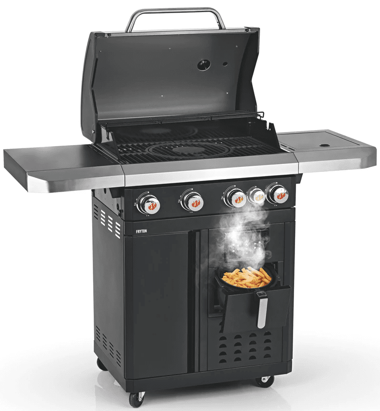 LANDMANN Fryton 4.1 Cook nije samo plinski roštilj, već potpuna vanjska kuhinja. Kao prvi na tržištu, kombinira snagu klasičnog pečenja na roštilju s ugrađenom 3,5-litrenom fritezom na vrući zrak (AirFryer). Sada možete istovremeno peći sočne odreske i pripremati hrustavi pomfrit ili povrće bez upotrebe ulja – sve na jednom mjestu.