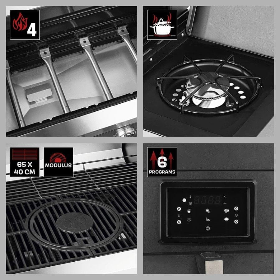Roštilj odlikuju 4 snažna plamenika od nehrđajućeg čelika (12 kW) i dodatna bočna cooK zona (3 kW), koja je idealna za pripremu umaka ili kuhanje priloga u tavi. Zahvaljujući Modulus sistemu modularnih rešetki, središnji dio možete zamijeniti vkovima, kamenjem za pizzu ili lijevano-željeznim pločama (dodaci dostupni zasebno).