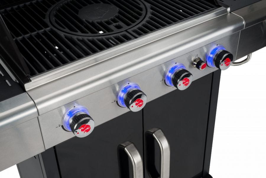 | Dodatno: | 4 kotača koji se mogu zaključati, zaštitni poklopac s ugrađenim termometrom, LED osvijetljeni kontrolni gumbi, ručke od brušenog nehrđajućeg čelika, držač pribora za jelo, sklopivi pomoćni stolić, uklonjiva posuda za skupljanje tekućine |