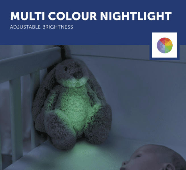 Prilagodljiva noćna svjetla: Birajte između prekrasnih boja – od tople crvene do raznobojnog sjaja za stvaranje savršene atmosfere Podesiva svjetlina: Tri razine svjetline omogućuju vam da prilagodite svjetlo prema potrebama vašeg djeteta 10 jedinstvenih melodija: otkucaji srca, bijeli šum, zvuk „shhh“, opuštajuća „lounge“ glazba, disanje, zvukovi oceana, afrički zalazak sunca i 3 uspavanke. Kontrola glasnoće: S tri razine glasnoće možete prilagoditi zvukove osjetljivim dječjim ušima. Automatsko isključivanje ili kontinuirani način rada: Odaberite želite li da Ro Bunny radi cijelu noć ili da se lagano isključi nakon 20–40 minuta. Pametni senzor za plač: kada beba plače, Rabbit Ro se automatski uključuje i umiruje bebu, tako da ćete imati manje prekida spavanja. Punjiva baterija: Ro Bunny ima dugo trajanje baterije i uključuje USB-C kabel za punjenje za vašu udobnost.Svojstva