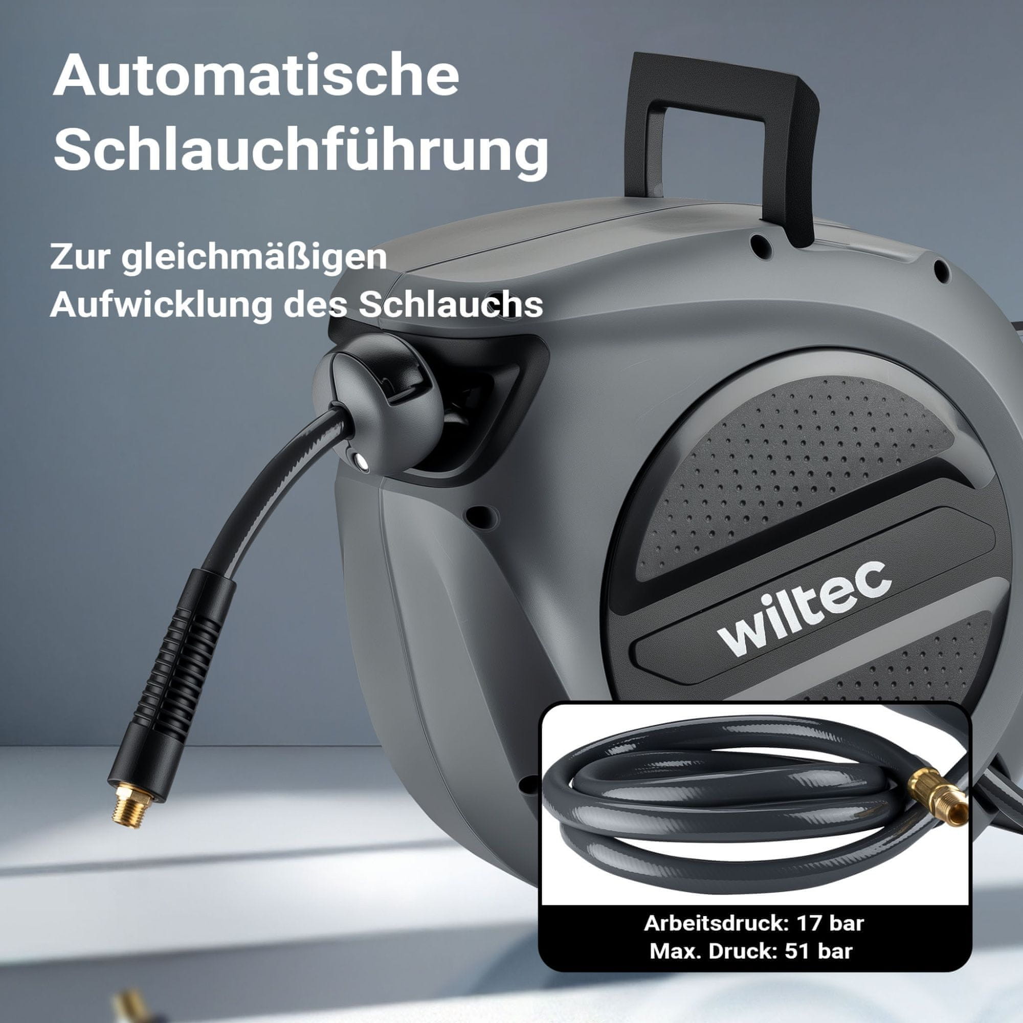 Wiltec Zidni kompresor, automatsko uvlačivo crijevo na kolutu, 15 m, 17 bara
