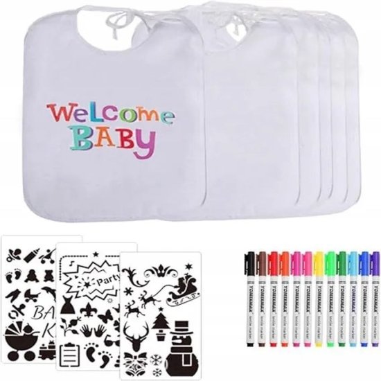 Nikcorp Set 6 pamučnih podbradaka za bojanje s 12 perivih flomastera, vodootporni, kreativna igra za djecu, 26x30 cm, bijeli