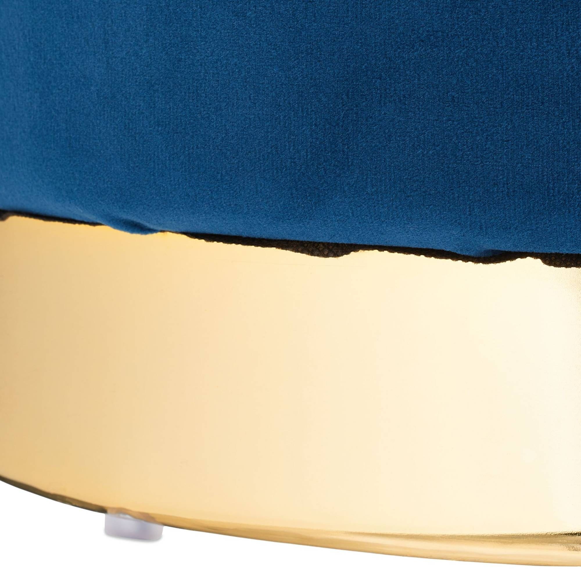 Okrugli plavi baršunasti stolac s uklonjivim poklopcem za pohranu deka, časopisa i sitnica. Zlatni detalji dodaju glamurozan izgled i čine ga savršenim dodatkom dnevnim sobama, spavaćim sobama ili hodnicima.