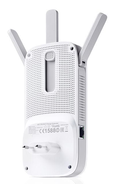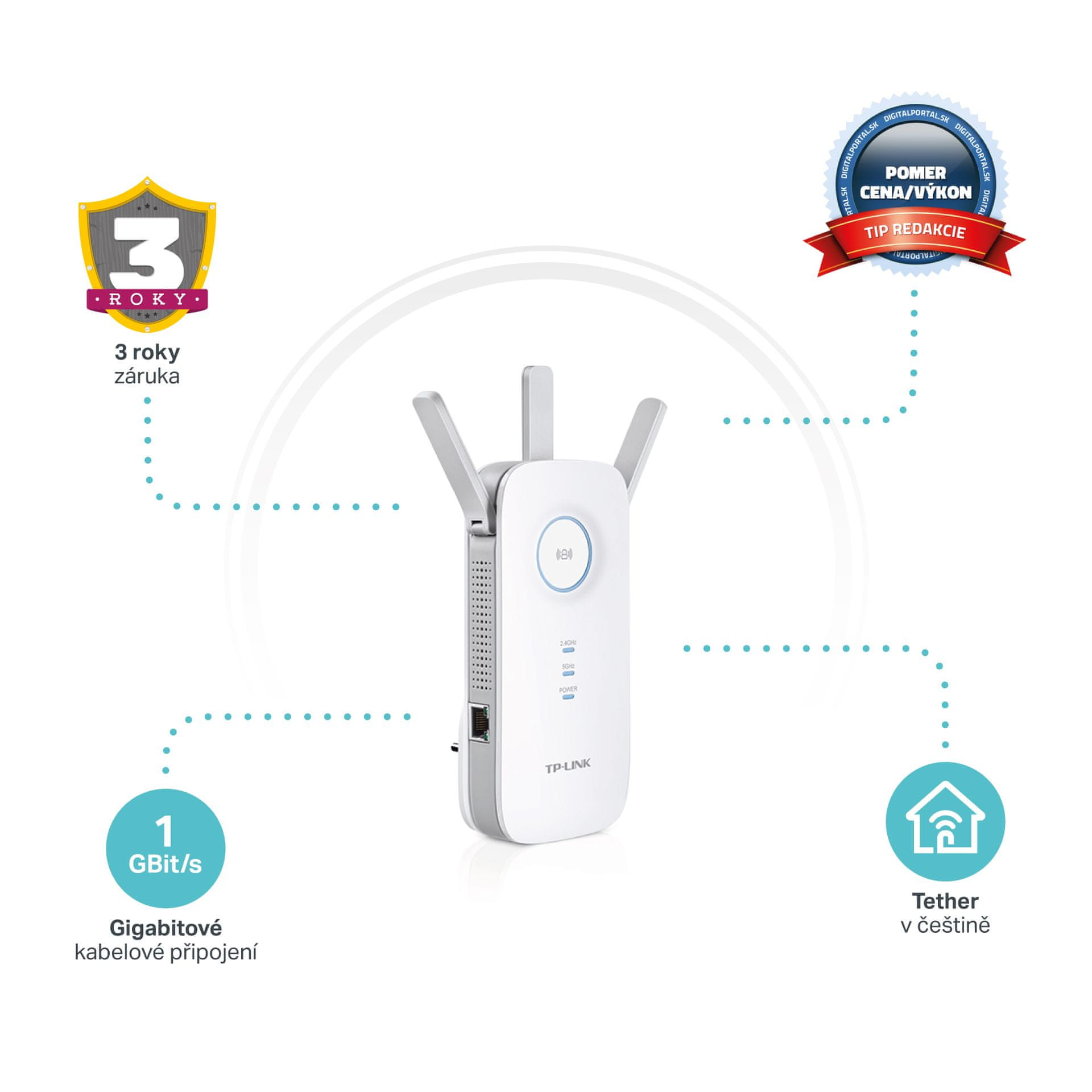 Pojačivač WiFi signala TP-LINK RE450 Dual Band radi na frekvencijama 2.4 GHz i 5 GHz, s brzinom do 1750 Mbps, 3 podesivim vanjskim antenama, manjom veličinom i indikatorom koji pomaže pronaći optimalnu lokaciju za produžavanje mreže.