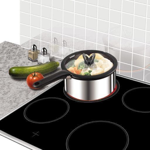 Poklopac za lonac promjera 18 cm s praktičnom sklopivom ručkom, koja omogućuje slaganje jednog na drugi. Poklopac je obložen silikonskim rubom i kompatibilan je s Tefal linijom Ingenio.